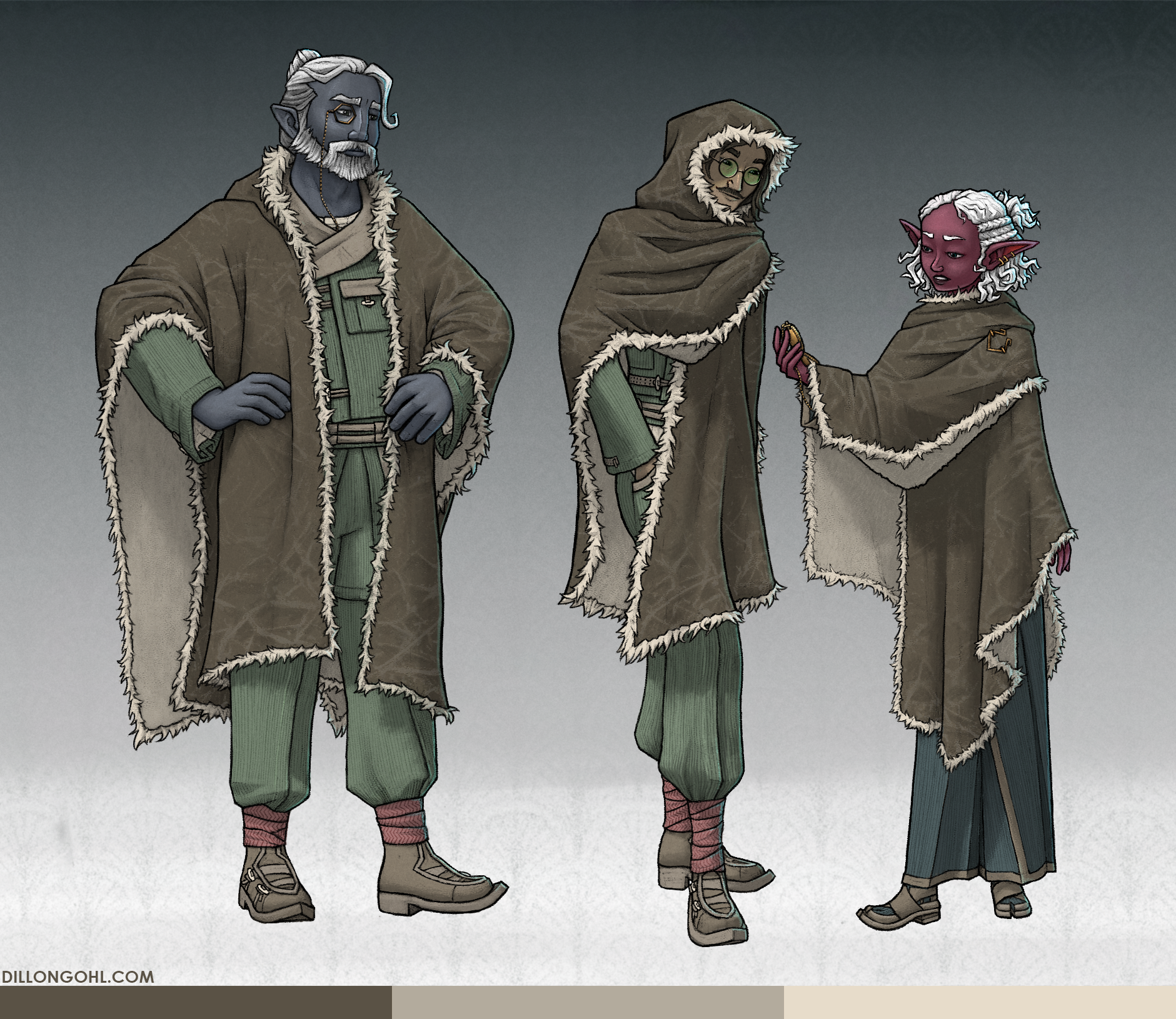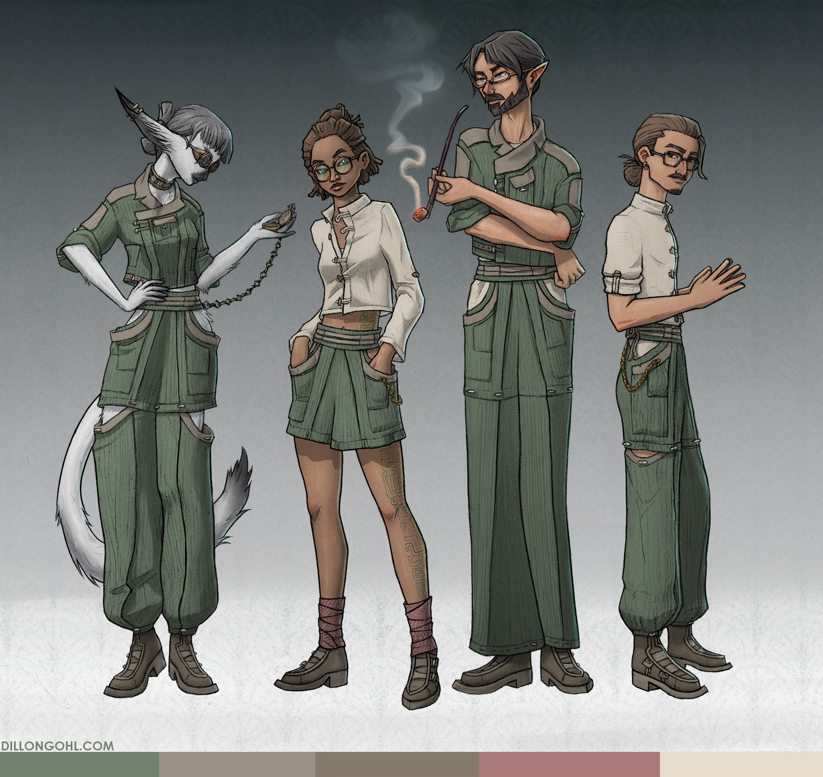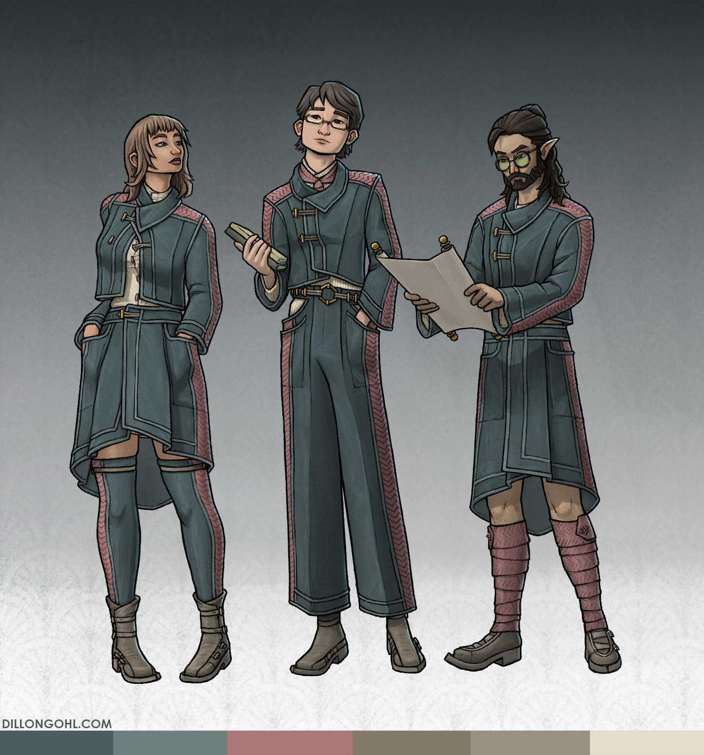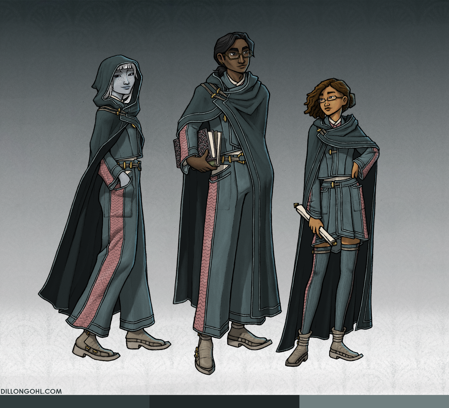 On KOSMOS, a multimedia worldbuilding project, I was tasked with designing and illustrating various uniforms for the students of a central location, Kaskadara University.